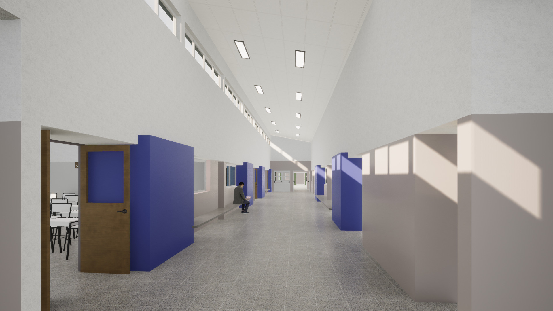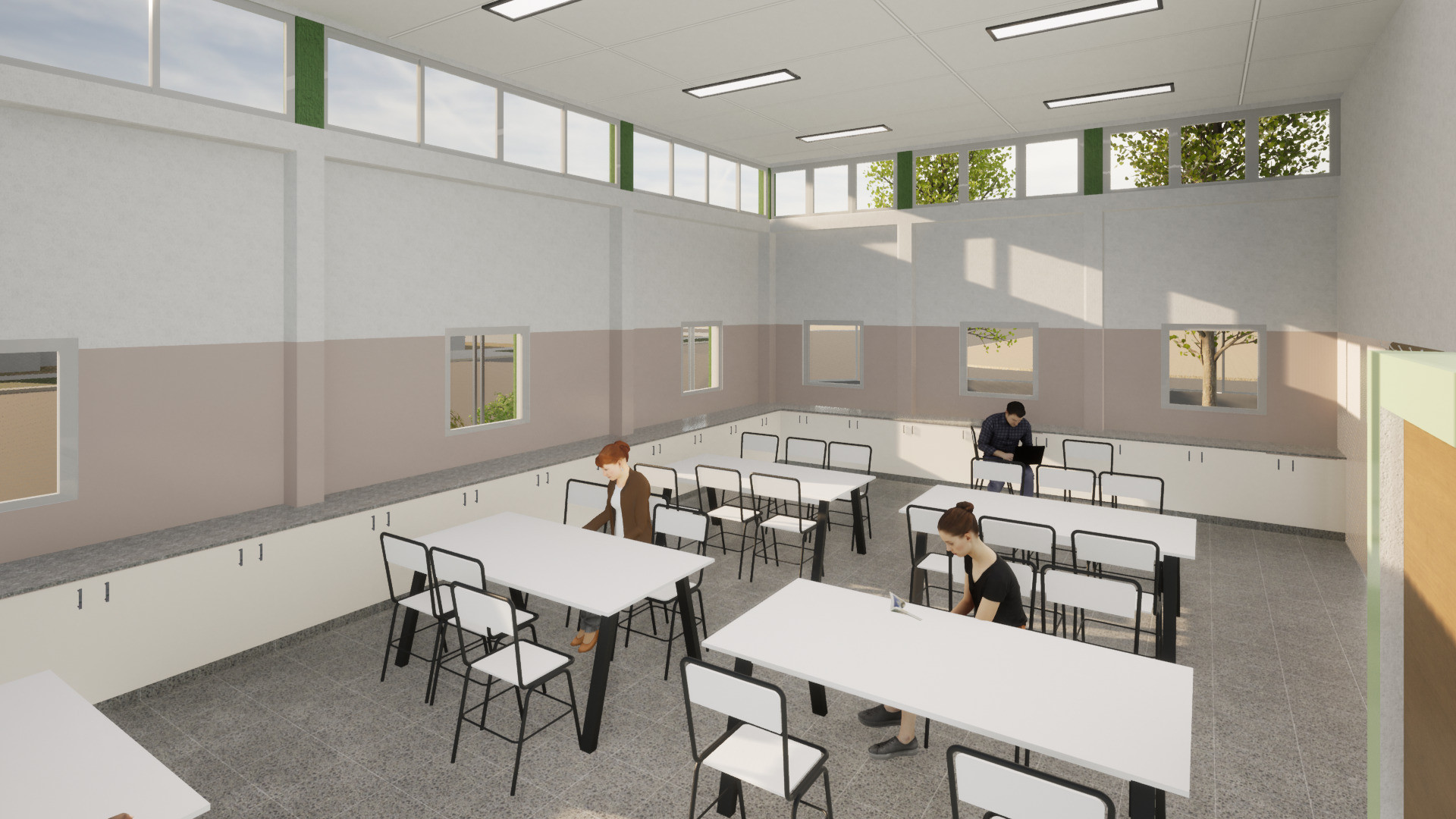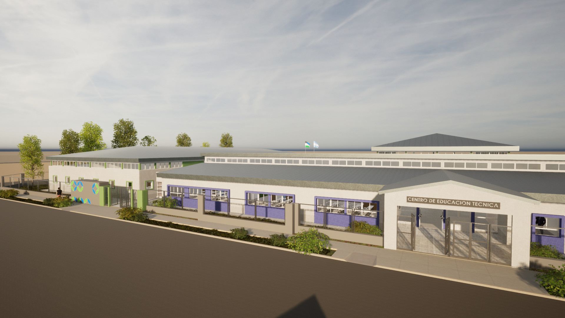 El proyecto se completa con un Salón de Usos Múltiples (SUM), comedor, cocina, depósitos generales y un sector exterior equipado como gimnasio deportivo, pensado tanto para actividades escolares como para el uso comunitario. La disposición del SUM y los talleres permitirá su funcionamiento autónomo fuera del horario escolar, favoreciendo el aprovechamiento integral del edificio.